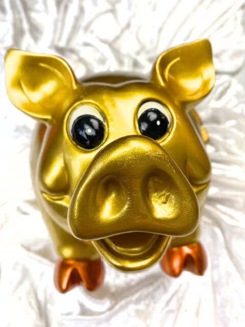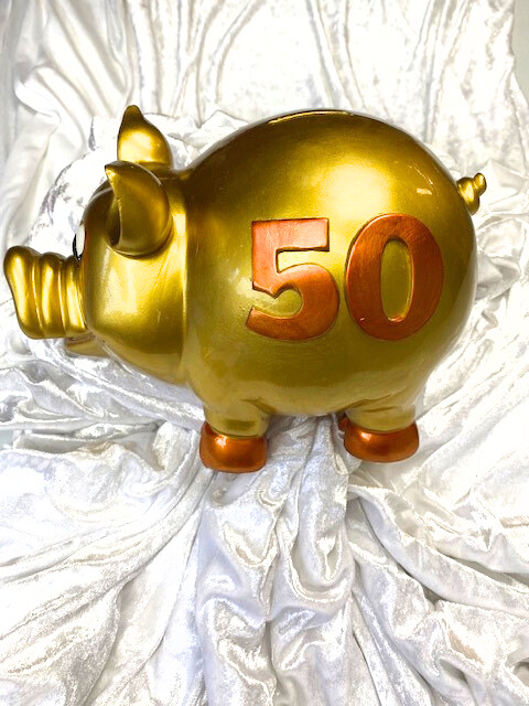 Sparschwein „goldfarben mit Aufdruck 50“